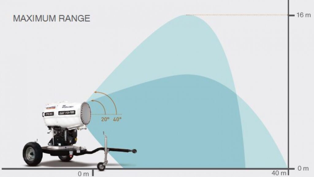 De Dust Fighter kan in windstille condities een nevelgordijn van 13 meter, 40 meter of 70 meter lang spuiten.